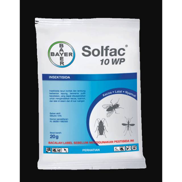 Solfac® WP 10 adalah insektisida piretroid untuk pengendalian yang efektif pada rumah tangga dan kesehatan masyarakat. Sangat dianjurkan untuk digunakan dalam industri pengolahan makanan, rumah, hotel, restoran, kantor, rumah sakit, kapal, pesawat, gudang, kandang, tempat pasar, pembuangan limbah dan lainnya.Deskripsi ProdukInsektisida racun kontak dan lambung berbentuk tepung, berwarna putih kecoklatan, yang dapat disuspensikan untuk mengendalikan kecoa, nyamuk, dan lalat di dalam dan di luar ruangan.Fitur utama:Bahan aktif: Siflutrin 10 %-Mengendalikan dengan cepat.-Memiliki residual yang lama.-Efek flushing yang kuat.-Tidak bernoda, dan tidak berbau.-Resiko yang rendah untuk mamalia-Dapat diaplikasikan di berbagai areaHarga per sachet Happy shoppingYuks diorderStok up