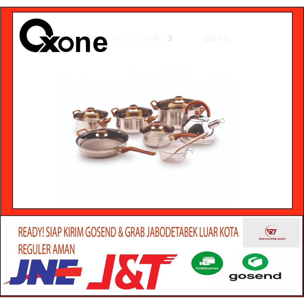 Eco Cookware OXONE OX-933Satu set alat memasak yang terbuat dari stainless steel yang dilengkapi dengan gagang yang terbuat dari kayu yang sangat berguna sebagai penangkal panas ketika sedang memasak. Satu set alat masak yang juga disertai dengan teko air akan sangat membantu Anda dalam mengolah bahan makanan dan minuman untuk disajikan bagi keluarga. Sangat cocok digunakan untuk di rumah ataupun di restoran.1 set panci yang serbaguna ini dapat anda gunakan untuk keperluan memasak anda sehari-hari,dengan desain yang classic dapat menambah kesan cantik pada interior rumah anda.1 Buah Sodet Kayu1 Buah Ketel Stainless Alumunium dengan gagang kayu1 Buah Wajan Penggorengan 26 cm dengan tutup kaca (25.5x6cm)1 Buah Panci 22 cm dengan tutup kaca (21.5x10cm)1 Buah Panci 24 cm dengan tutup kaca1 Buah Panci 26 cm dengan tutup kaca (25.5x12cm)1 Buah Panci Penggorengan 22 cm dengan saringan dan gagang kayu panjangUkuran :Saucepan ( 1) : 17.5x8cmSaucepan ( 2) : 25.5x6cmStock pot ( 1) : 19.5x9cmStock Pot ( 2) : 21.5x10cmStock Pot ( 3) : 25.5x12cmTips:Masakan Bersantan1.Agar santan tidak pecah, panaskan santan dengan api kecildan aduk-aduk hingga mendidih.2.Masaklah terlebih dahulu bahan-bahan dengan santan encer menggunkan ECO COOKWARE SET OXONE hingga bumbu meresap.3.Masukkan santan kental, aduk dan panaskan kembali dengan api kecil hingga kental. Makanan bersantan mudah basi, oleh karena itu setiap dipanaskan harus sampai mendidih.Oxone OX-933 Eco Cookware Set 12+2 pcsFull Stainless Steel BodyAluminium Capsuled BottomBrown Glass Cover Mirror Polish Interior & ExteriorBrown Bakelite Handles with Golden Plate12+ 2PcsModern wooden colourMirror polish interior & exteriorBelly shape, rolled edge &
