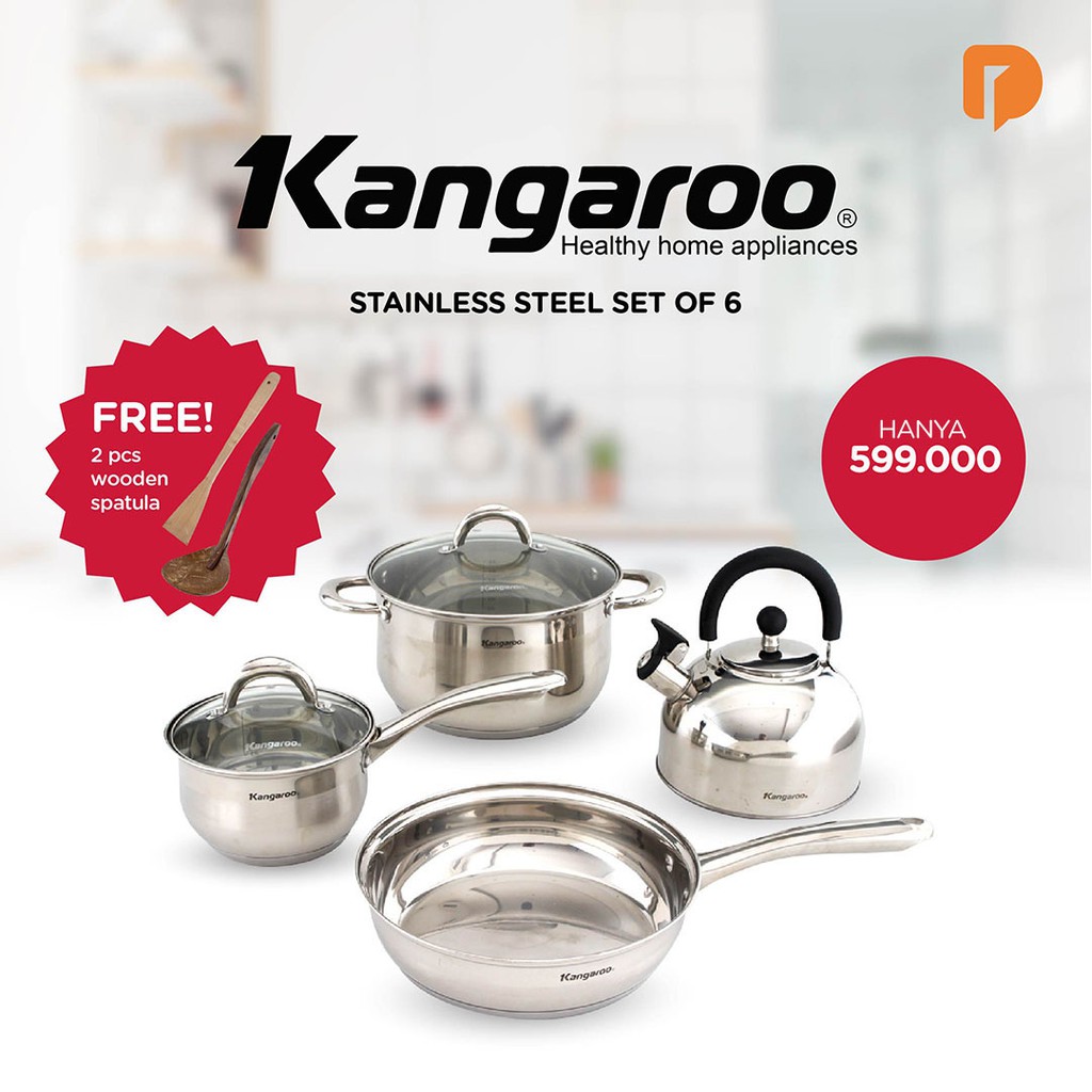 Kangaroo Stainless Steel set of 6Set panci dengan material stainless steel kualitas premium yang lengkap dan pas untuk kebutuhan memasak harian Anda.Dengan tampilan elegan dan bahan berkualitas tinggi, sehingga memasak lebih mudah dan dapur makin mewah.1 set terdiri dari:- Sauce Pan, Diameter 16 cm dengan Tutup Kaca - Dutch Oven, Diameter 24 cm dengan Tutup Kaca - Fry Pan, Diameter 24 cm- Teko, Kapasitas 2.5 liter- FREE Sendok & Spatula KayuKenapa harus Kangaroo Stainless Steel set of 6?- Material Stainless Steel 304- Cepat panas- Tanpa zat karsinogen penyebab kanker- Bebas PFOA - Timah dan Cadmium- Teknologi NANO membantu permukaan lebih tahan gores- Lapisan bawah 5 layer dengan teknology tinggi (Inox, Aluminium, Metal, Aluminium & Inox 340) - Penutup yang disertai dengan lubang steam/uap membuat makanan anda cepat matang dan terbuat dari lapisan kaca memudah anda untuk melihat keadaan makanan dari luar. - Dapat digunakan untuk semua kompor (Termasuk Kompor Ind
