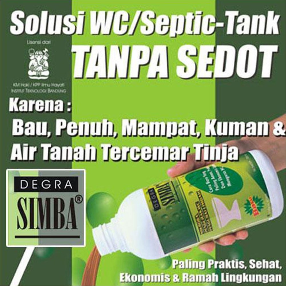 CARA PEMAKAIAN DEGRA SIMBA A. SEPTIC TANK MEMILIKI LUBANG UDARA.1. Tuangkan 1 botol DEGRA SIMBA (ukuran 500 ml) ke dalam closet.2. Siram dengan air secukupnya dan biarkan selama 5-6 jam (sebaiknya saat malam hari).B. SEPTIC TANK TIDAK MEMILIKI LUBANG UDARA1. Tuangkan 1 botol DEGRA SIMBA (ukuran 500 ml) ke dalam wadah (ember)2. Campur dengan air (perbandingan 1:2) dan biarkan selama 5-6 jam di udara terbuka agar bakteri dapat hidup dan berkembang biak3. Masukan campuran Degra Simba + Air ke dalam closet WC4. Siram dengan air secukupnya agar cairan Degra Simba masuk ke dalam septic tank.Dalam waktu 1 minggu, isi septic tank / WC akan terkuras hingga 80 % menjadi air (H2O) yang meresap ke dalam tanah (tidak mencemari lingkungan) dan gas (CO2) yg tidak berbau... Degra Simba merupakan bio-processor untuk pengolahan limbah organik dari sektor perumahan, hotel, apartemen, rumah sakit, pabrik makanan olahan, restauran dan gedung perkantoran. Bagi perumahan DEGRA SIMBA digunakan untuk menguras WC tanpa sedot.Degra Simba mengandung mikroba probiotik yang aman bagi manusia dan lingkungan. Manfaat lain: mengatasi saluran yang tersumbat bahan organik dan menghilangkan bau busuk pada kloset. Teknologi ini sudah lama diterapkan oleh negara-negara maju seperti Eropa, Amerika, Jepang, Australia dan lainnya. Cara pemakaian pada WC: cukup masukan satu botol degra simba ke dalam kloset, tunggu 4 s/d 5 jam maka isi septic tank rumah anda akan terkuras dalam waktu 1 minggu.Lebih kurang 5 tahun yang lalu, KPP Hayati ITB – Bandung dipimpin oleh DR. Ir. I Nyoman Pugeg Aryantha bekerja sama dengan PT. RSDH melakukan penelitian dan menghasilkan produk dengan nama “DEGRA SIMBA” yang diambil dari kata DEGRAdable SIMbiosis BActeria