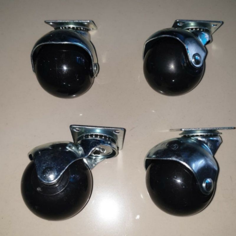 Barang ready, pembelian roda saja (tanpa pemasangan di kaki lemari) bisa langsung dikirim ya.4(empat) pcs roda Caster Polypropylene (PP) Wheel Black Bulat.Plat hidup (ball bearing)Diameter : 2 inch (50 mm).BPC 50Tinggi roda : 50 mm.Ukuran plat : 40 x 40 mm.Bahan awet dan kuat.TC Alum